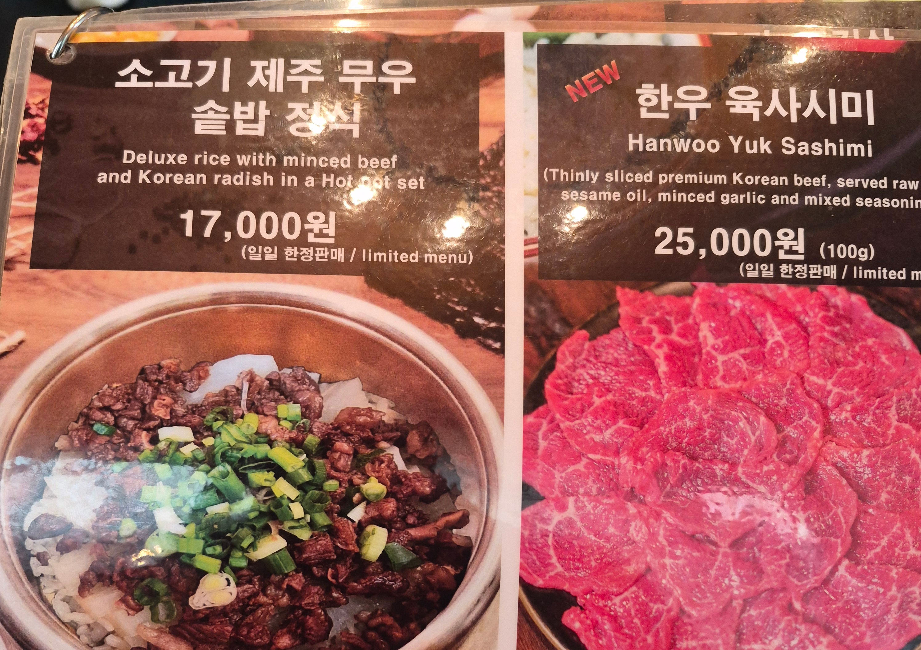 메뉴판은 이렇습니다. 저녁이었으면 한우육사시미도 먹어봤을 텐데 아쉽게도 이베리코 돼지목살 숯불구이 정식과 닭다리살 숯불구이 정식을 주문하였습니다.