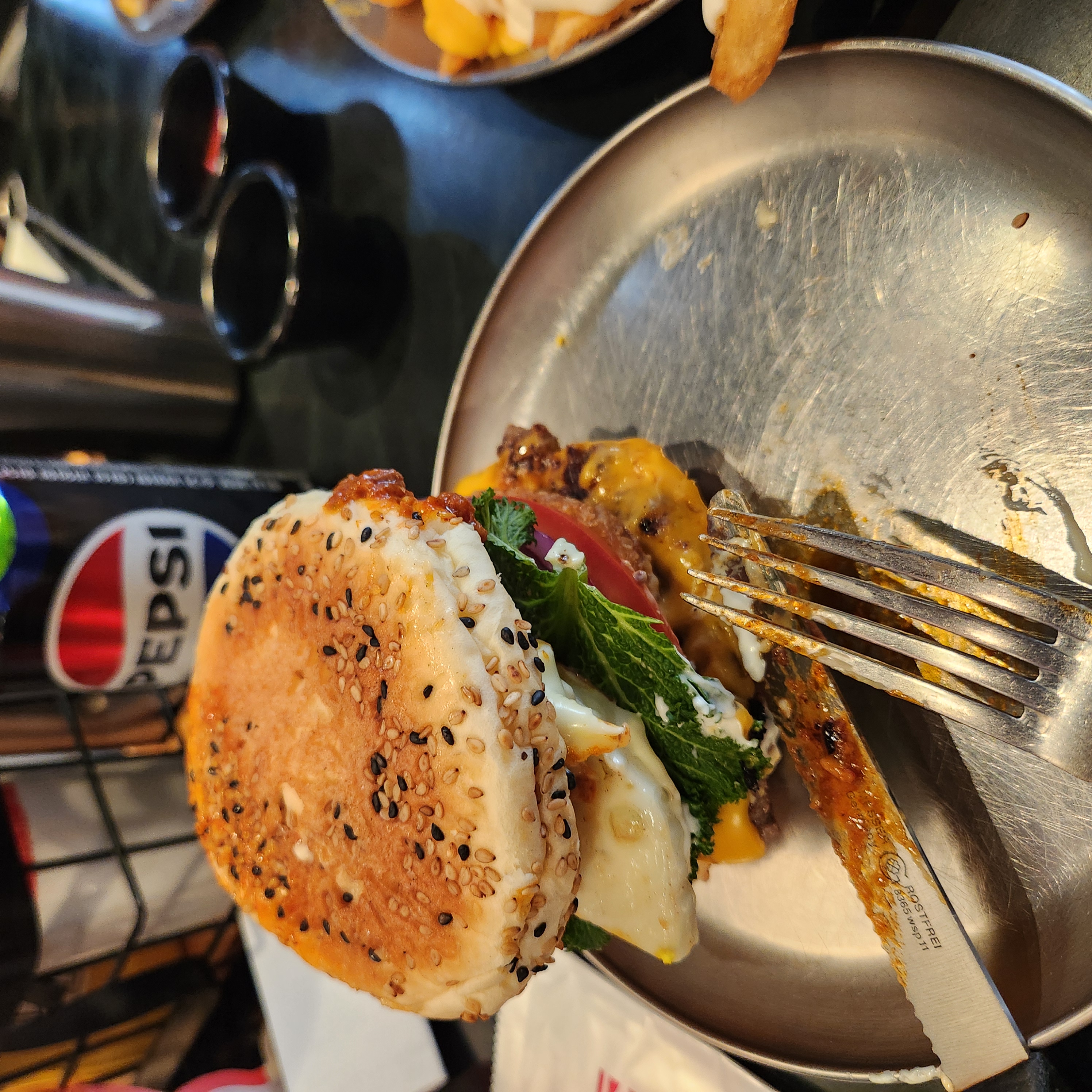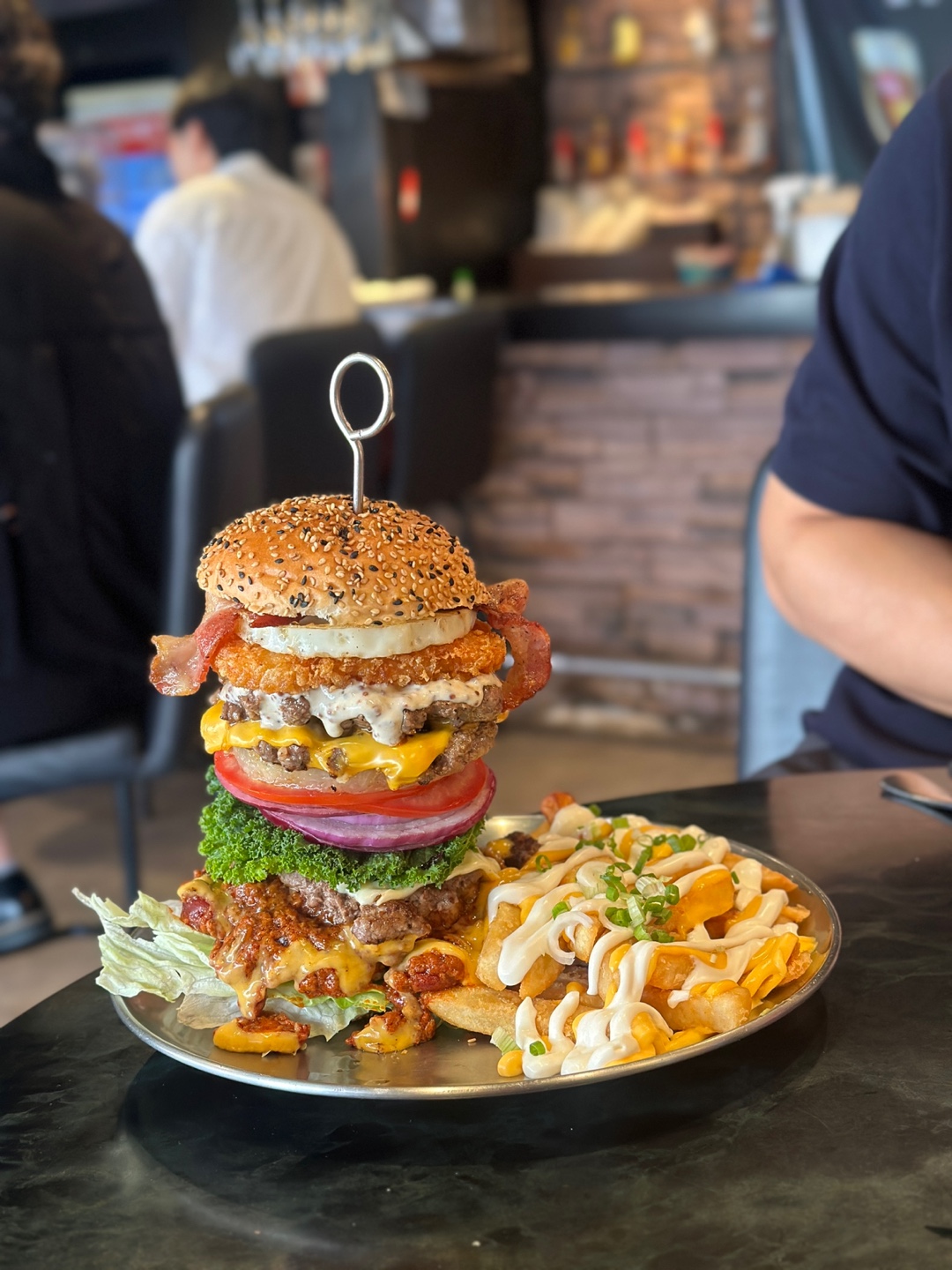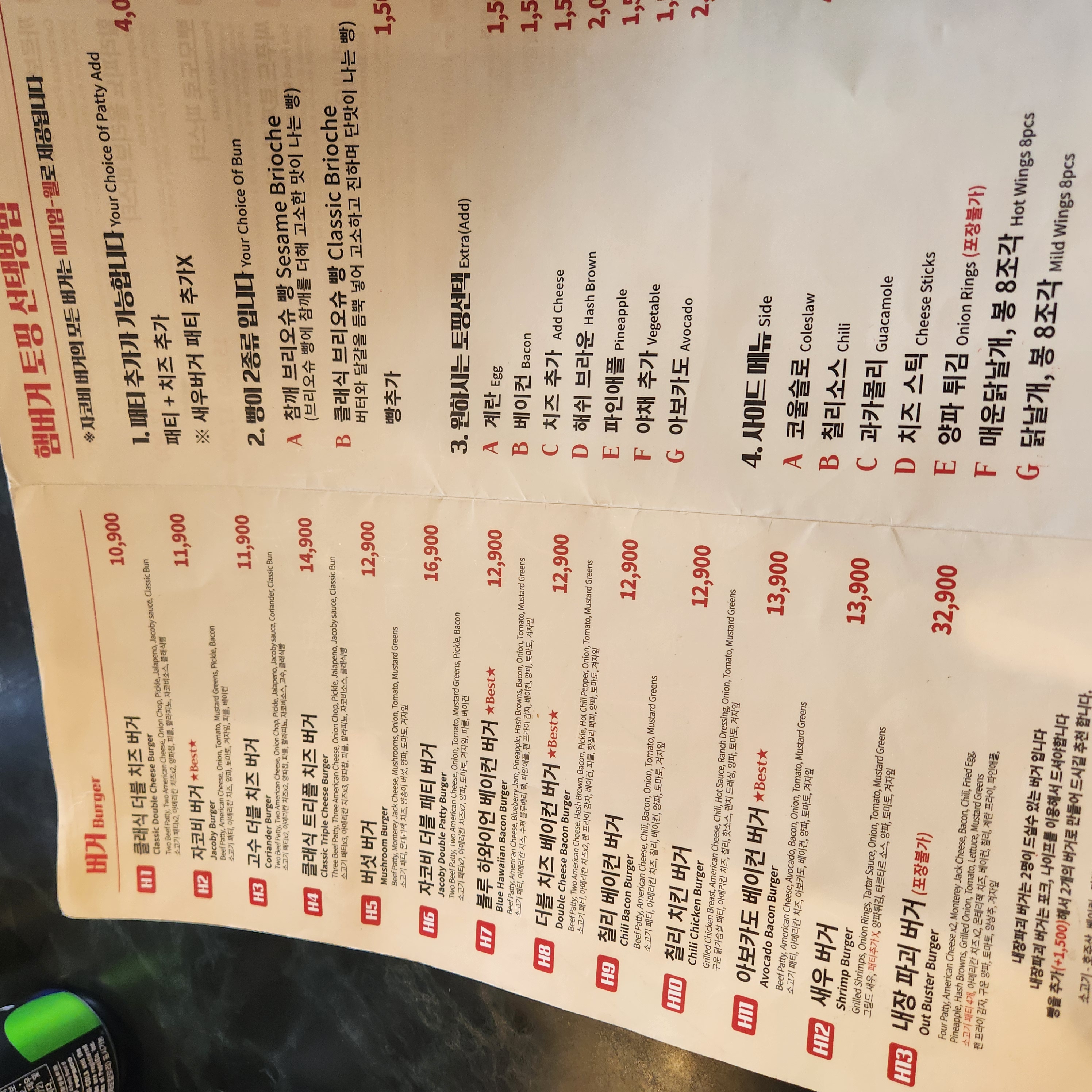 내장파괴버거는 안에 토핑이 많아 눕혀서 먹어야 한다. 안에 들어가 있는 패티만 무려 4개!